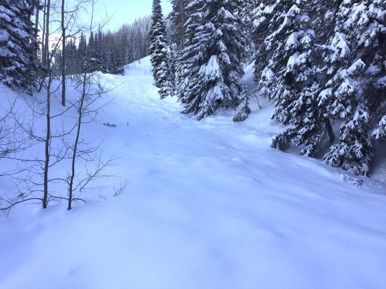 Unknown date. Jan. 6 was just a guess. It took out a bunch of trees and/or bent them over. Having skied in this area for almost a decade, this is the first major avy I have seen at this location. Photos were shot at 8950 ft.