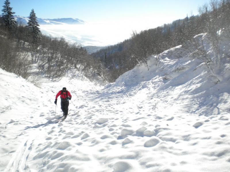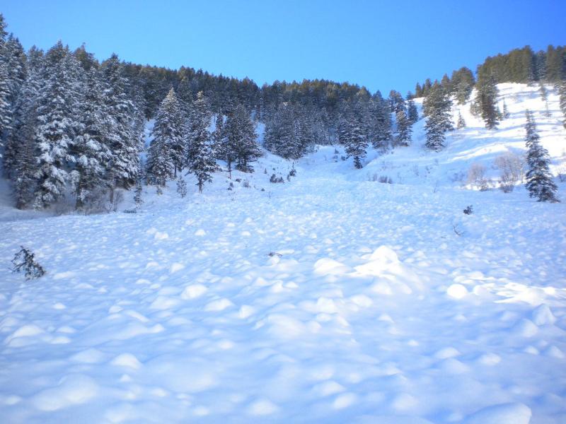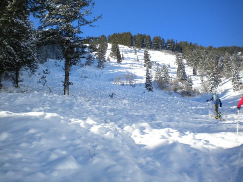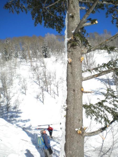 Old slide, but humbling. Flag tree stripped of branches approximately 20-25 ft. high. Hard snow deposited on the trunk. Several photos of the deposition. Hiked for 600 vertical ft. on deposition pile. Two separate slides paths fed into same run out path.