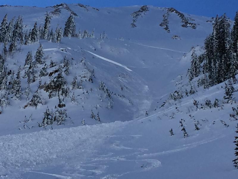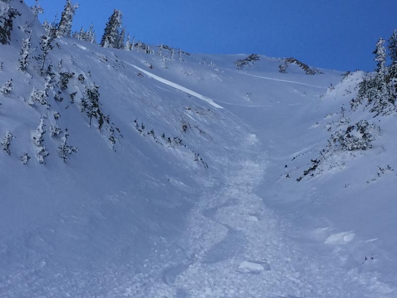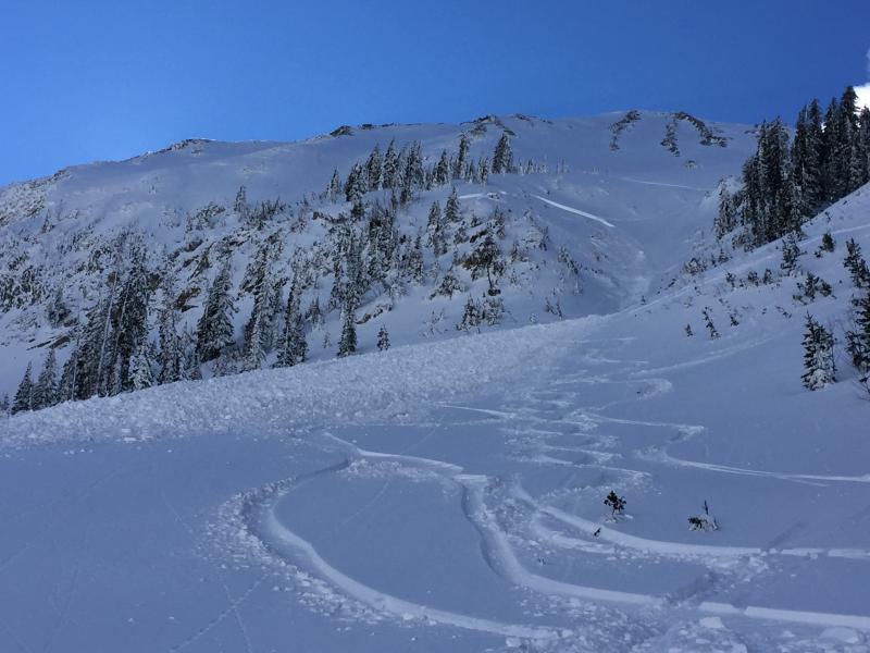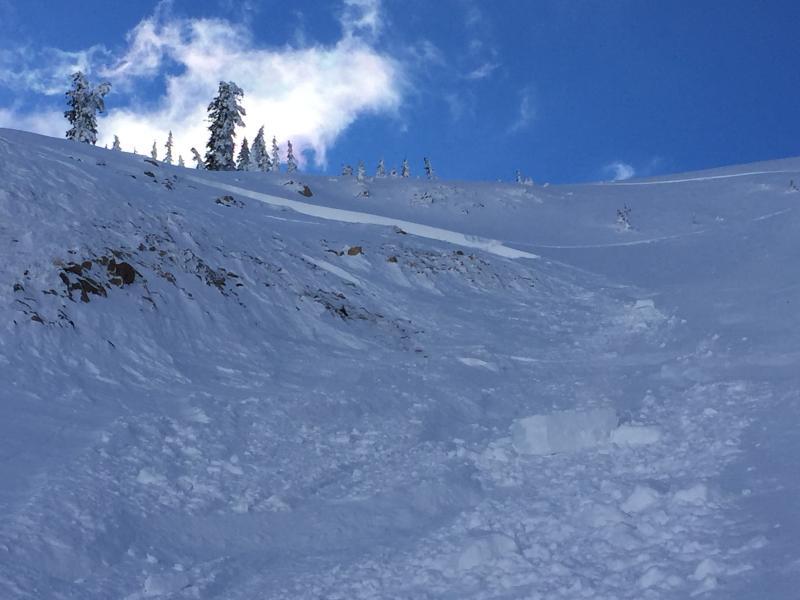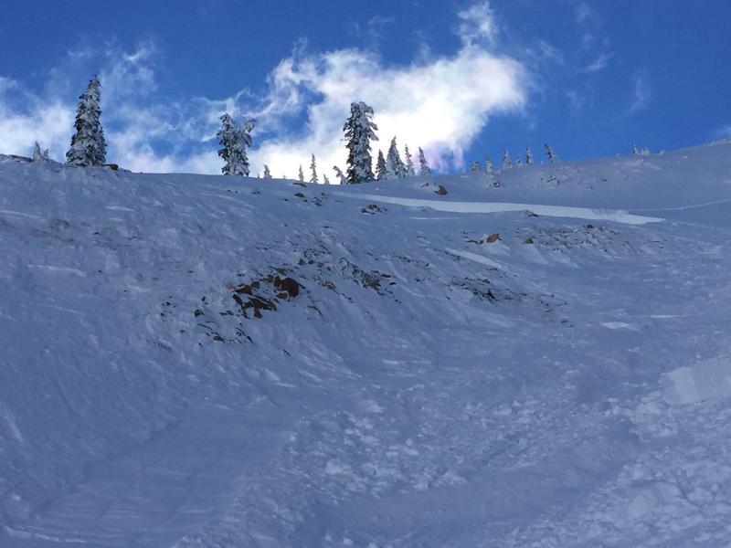 This morning at the Geyser Pass TH I ran into the party of two that triggered this slide sometime after 3 PM on Monday 1/16/17. I think the rider that triggered the slide was on a snowboard, but I am not 100 percent sure. They told me that Rider 1 triggered the slide and it broke at his feet. He was not carried down slope. Rider 2 was above Rider 1 and was not affected by the slide. Rider 1 descended the bed surface and Rider 2 traversed to skiers left and descended the steep rollover above Tele Heaven. See the photos below for their route off the ridge line that leads to the summit of Tuk No. They skied a more conservative line in the glades on Sunday 1/15/17, but this time they took a line higher up the ridge and more towards skiers right. They entered the steepest part of the gully in the middle of Gravel Pit Lanes. This section has rocks and a very steep rollover. It also faces due north. The snowpack is somewhat shallow in this area. I walked up the bed surface, but was unable to make it to the crown because it was quite steep and rocky. I was maybe 100 feet below the crown. From my vantage point I sighted the slope at the crown around 40 degrees. I can generally sight within 2 degrees so it is safe to say the slope at the crown is between 38 and 42 degrees. The suspected weak layer is facets. The snowpack here is shallow and rocky and is a very likely spot to find faceted snow. The slope also appears to have been cross loaded. So you have windslab sitting on the weak facets and it failed under the weight of the skier. The slide ran maybe 600 feet and 150 feet wide. The debris buried the party's skin track and also several tracks below on Tele Heaven. The party said they would report the incident, and I hope we get a first hand account from them of what happened.