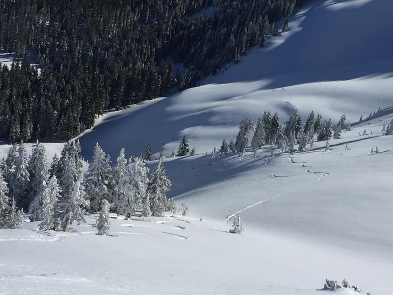Here's a shot of their tracks from their drop in point off the ridge line. They headed far skiers right and into the steep gully. The gully is seen in the shadows.