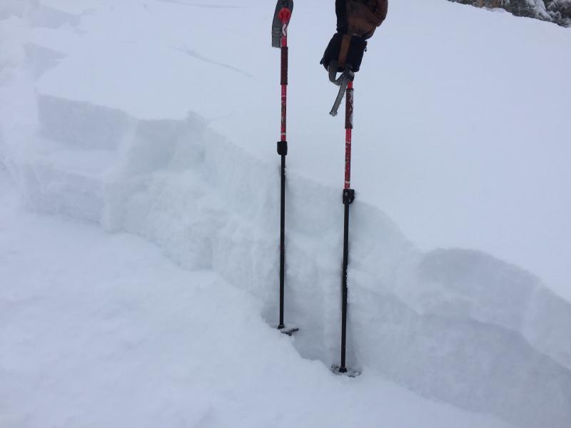 A closeup of the crown face. You can clearly see the two layers of snow comprising the slab. The top is fist density from the snowfall that started late Friday. The bottom layer is slightly denser, maybe four finger minus.