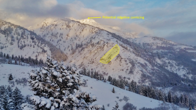 Slide on a south facing aspect near the mouth of Black Canyon, viewed from a distance near the Birthday Bowls on Cutler Ridge. Ran a few hundred feet, presumably in the storm snow, but certainly not close enough to judge any additional information. The map says the slope is steep, maybe 40 degrees or so.