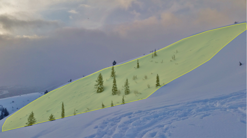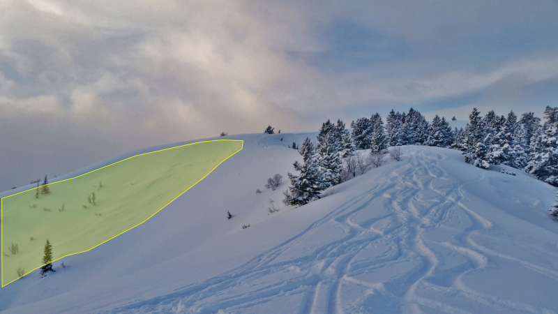 Picture 2:  The top of the slide off the ridge.  Note the crown off the other side of the ridge as well and the tracks that just squeeze in between.