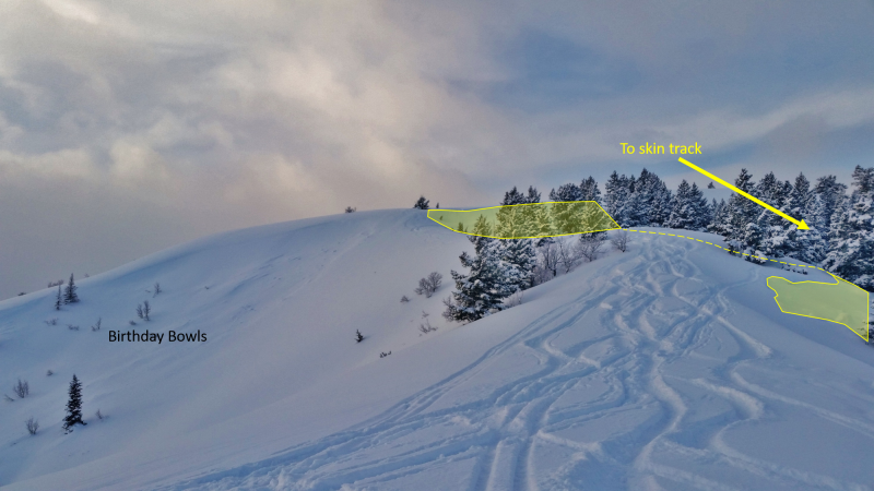 Photo 1: Top of the Backyard slide, dotted indicating where the crown wrapped around the gully, situated above the standard approach for all of Cutler Ridge.