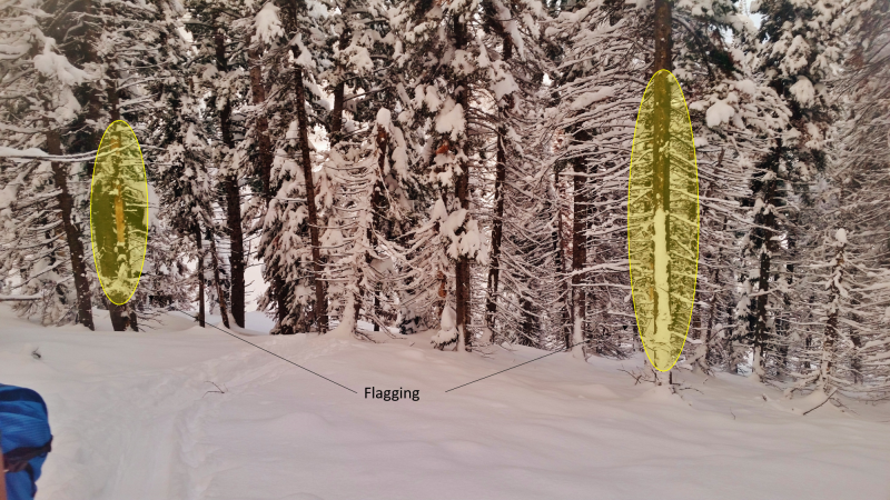 Photo 2: Flagging on trees near the toe of the debris pile, just skirting the up-track for the Backyard. Note the bumps in the snow surface; this is the debris pile covered with a few inches of fresh powder.