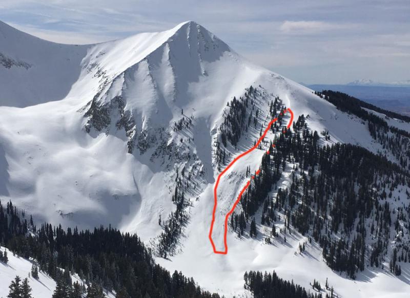 Forecaster note: Heavily wind loaded area, this slide initiated as a 3' wind slab, entraining storm snow and likely stepping down to a buried nsf layer on it's 1000' descent.