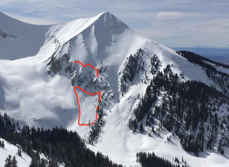 Forecaster note: Avalanche first released above the cliffs and then triggered a second and wider slab below the cliffs in Tele Gold proper.