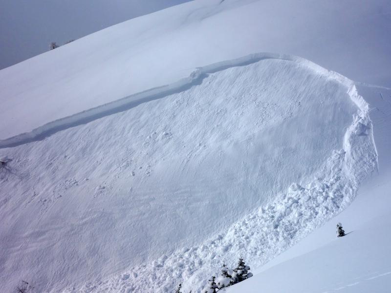Partner and I had been poking around on SW facing slopes all day, and finding them to be surprisingly spooky, with facets above a suncrust formed last week (see separate observation for pit profile, etc.). As a result, chose a 30 degree slope for our exit run. First skier skied down to safe spot. Felt a minor collapse at the safe spot, and watched an adjacent, crossloaded, slope (which fed into a gully) slide. Seems to have run on the facets above the suncrust that we had been noting all day. However, when trying to examine the weak layer above the sun crust, couldn't see much more than broken particles with the occasional facet mixed in. Also, although I could not see any surface hoar, the way it triggered remotely was very much like surface hoar. Other west facing slopes on the other side of the gully cracked, but did not slide. Thinking that they did not have enough of a slab, and really needed more of a slab from wind load to slide. Photos below.