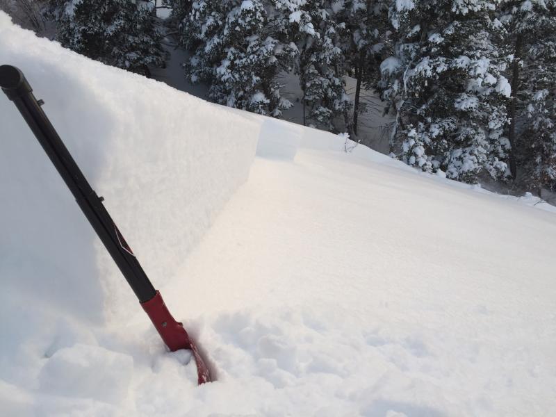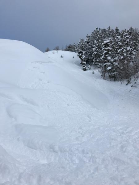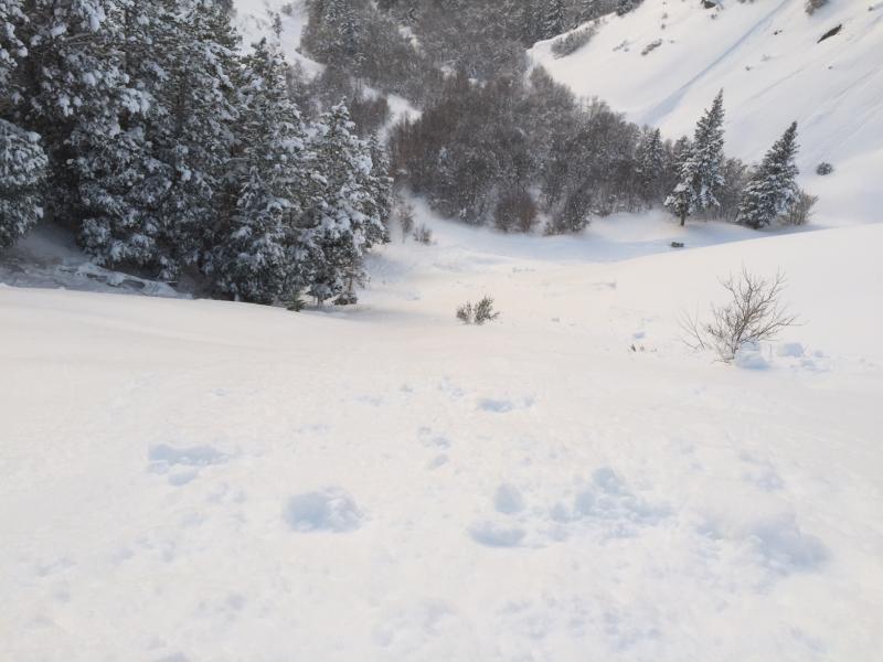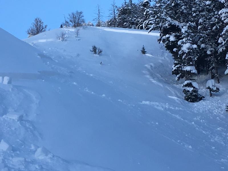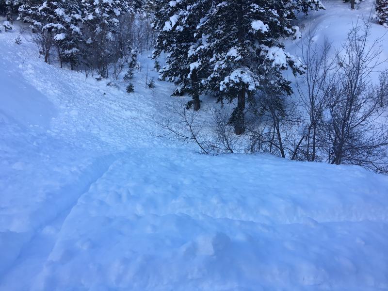 Paige took a look at this 1/27/17. There were no tracks leading in to the slope from the top though there were lots of sled tracks just a short way to the north. Possible it could have been remotely triggered from there or from below as folks riding up the canyon will sometimes carve up the lower part of the path. The deposition covered the existing snowmobile road. Hard to tell how deep but up to at least 6' in some spots. Definitely failed on buried surface hoar.