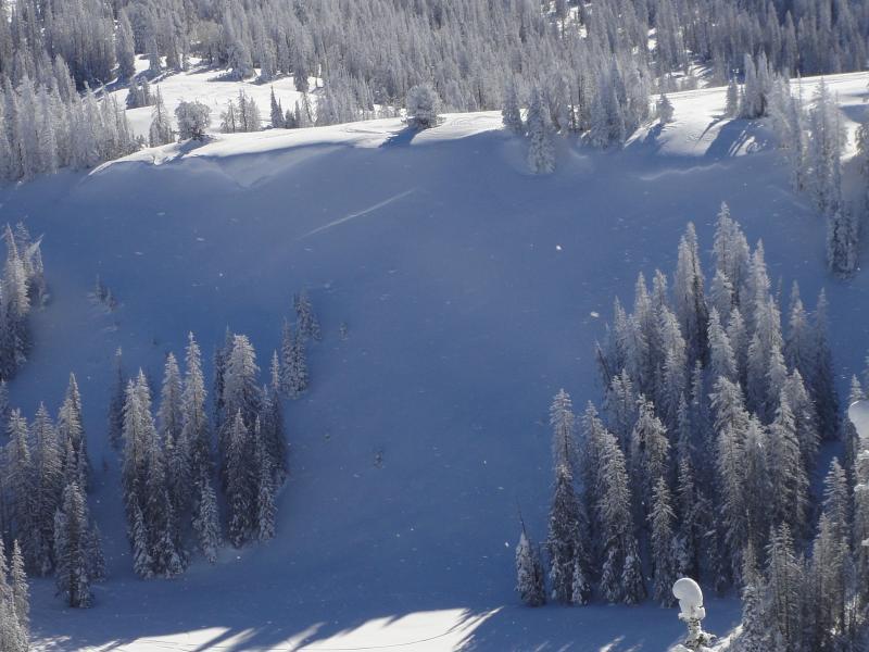 This slope was heavily loaded during our wind event on the 22nd. I haven't been to area since so the occurrence date is a guess. Last week, this slope was hit hard by riders jumping off the top and landing below the crown location possibly helping stabilize the snowpack below the new snow.