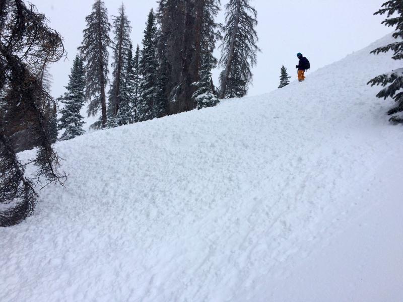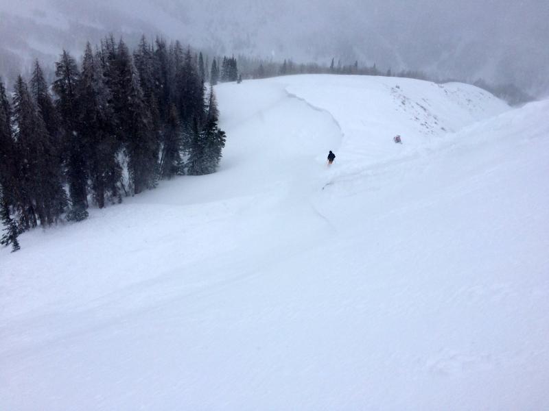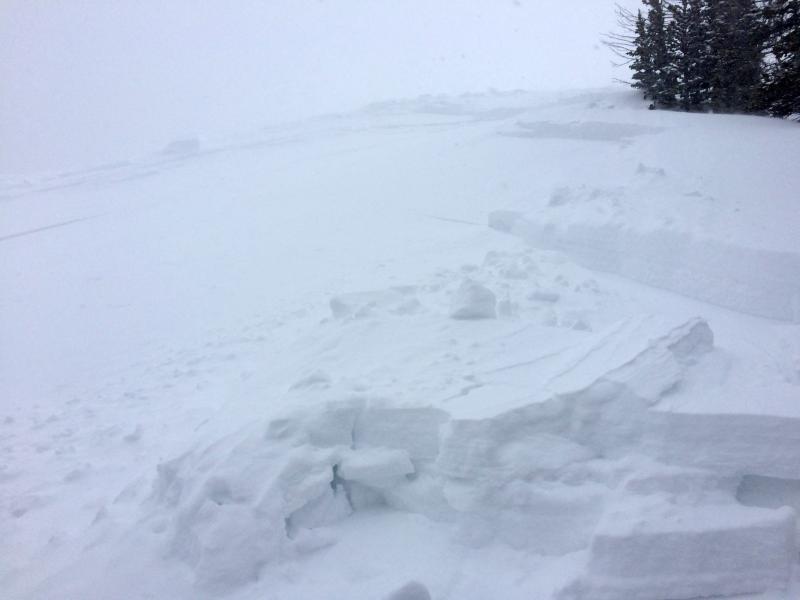 Cornices were super sensitive today and soft slabs were easily triggered with cornices. This was one of the larger we intentionally triggered, which was not on a very big slope and is at fairly low elevation. No doubt there was similar natural activity going on in more wind loaded areas.