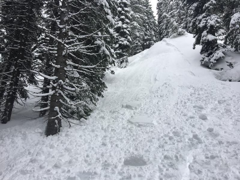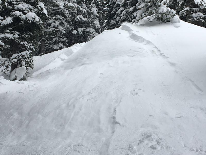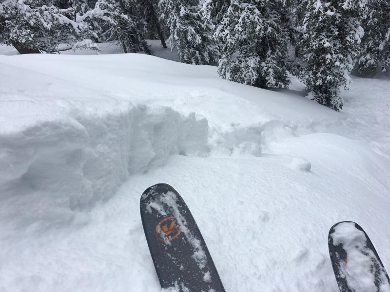 I intentionally triggered a small storm slab on a very steep test slope just above the campground. It ran on the solid and slick 2/10 rain-crust.