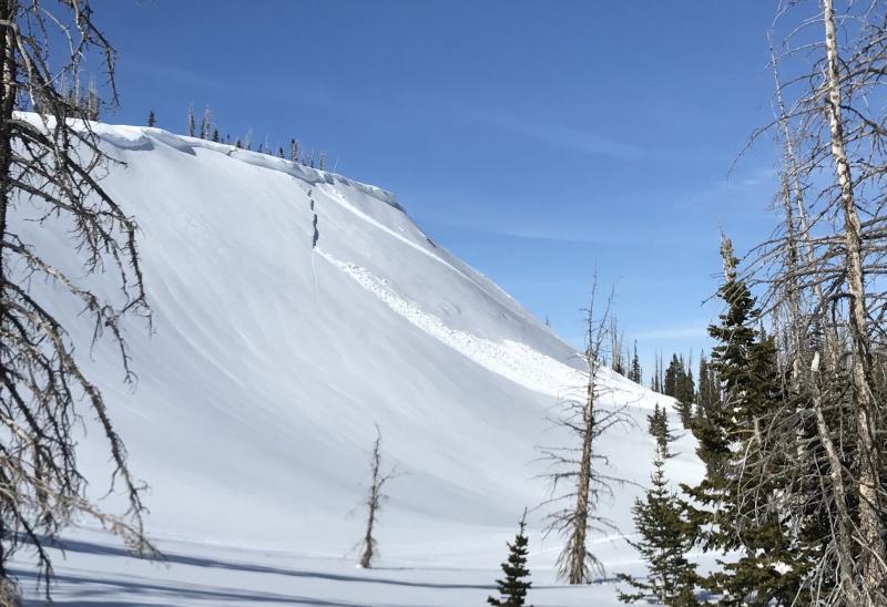 Snowmobilers triggered several avalanches on steep leeward wind loaded slopes. Judging by the photo, it appears that the slope was facing the sun enough for it to heat up and possibly make the drifts become unstable. Theser are the type of human triggered avalanches that are still possible along the highest ridgelines. This is why the avalanche danger is still rated at MODERATE for these areas.