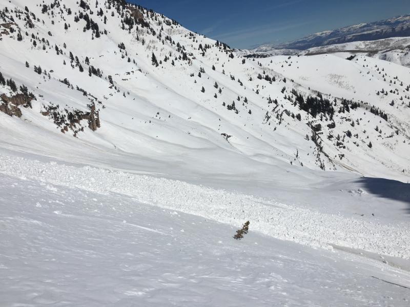 Tour to the saddle of Primrose Cirque. 3 or 4 separate wet loose avalanches released around noon starting on the east facing cliffs of Robert's Horn as they warmed in the sun. Decent corn skiing on the bottom half of Primrose exit. Pic 1, 2, 3: Wet debris runout into the gut of Primrose. Pic 4 (sideways): Interesting route selection with cliffs above and below of a party behind us after slides occurred.