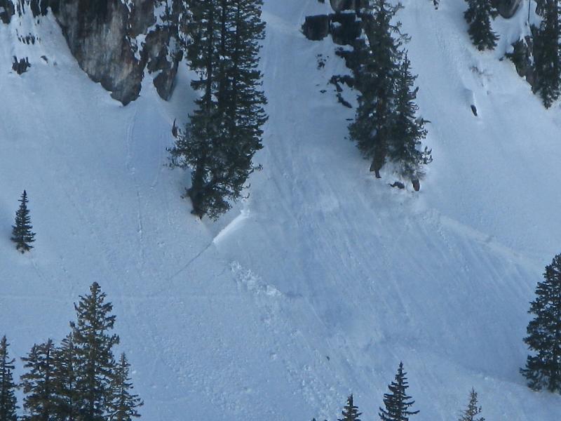 Could have been caused by a cornice fall to trigger the upper-most part of the slide (in the chute) but difficult to tell. There was a snowmobile side hill track that spanned across the middle area of the slab as well. It looked fairly fresh when we arrived but with so many sledders out it was difficult to tell old tracks from more recent. It was definitely triggered in the morning or early afternoon as the debris was fresh and didn't have the 1" of dust from last night.