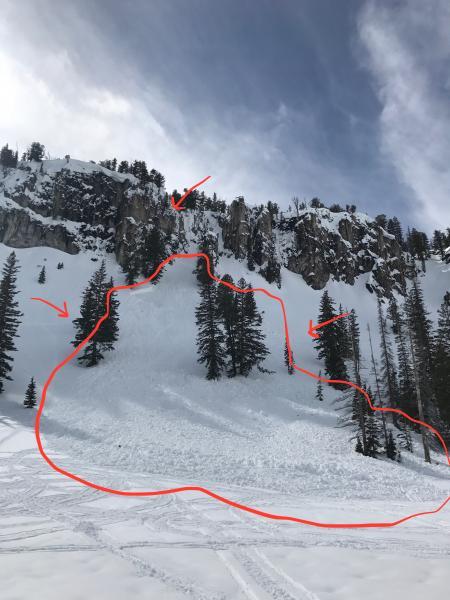 Photo below outlines the interestingly shaped crown and debris pile. Arrows point to possible trigger points. Maybe cornice fall into upper chute or could have been the snowmobile track entering and exiting on the left and right.