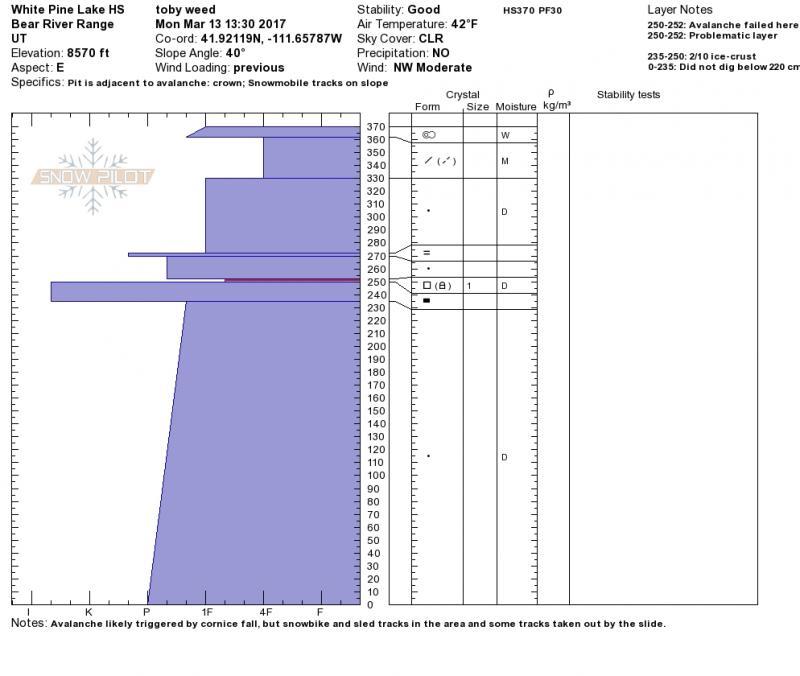 I went up to the avalanche site on 3/13/17. The impressive and unexpected hard slab avalanche was an isolated event. No similar avalanches were reported or observed in the area. However, an avalanche that appears to have run on the same 2/10 ice-crust and also on an upper elevation east facing slope was triggered by a sledder on 3/3 near Hidden Lake in Gibson Basin, just north of the state line. (view report here)