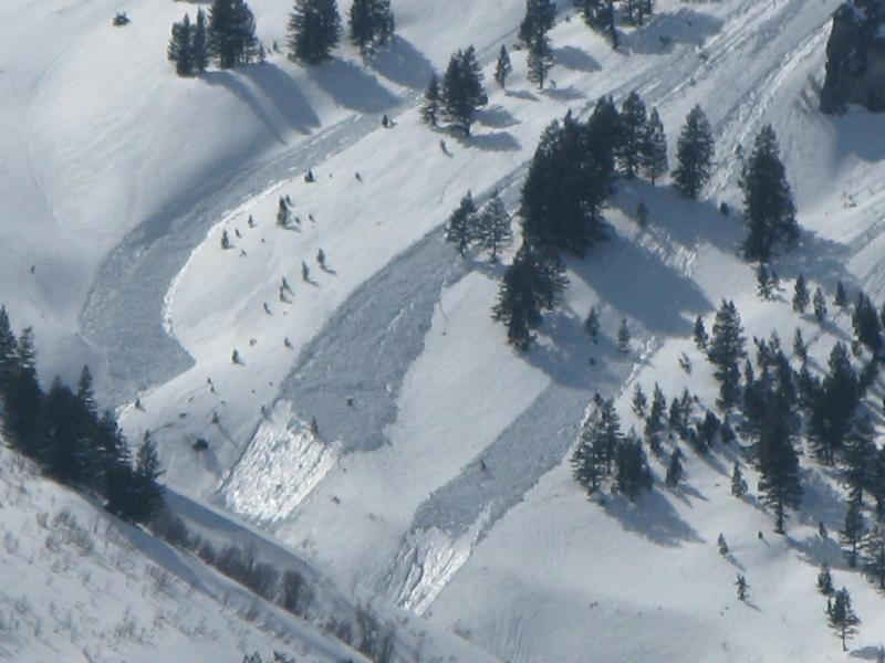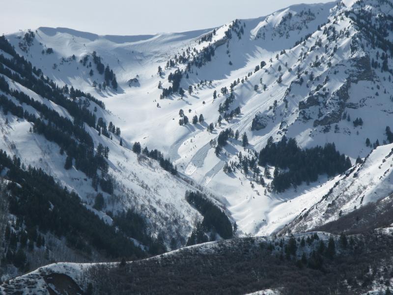 Fresh loose wet avalanches were visible from a distance in Pine Canyon. I have no idea when these occurred, but during the heat on Friday is a good bet. Wet avalanches like these will become more likely with above normal temperatures in the next few days.
