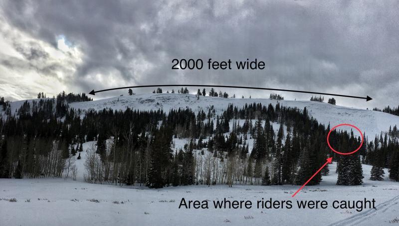 A group of 5 was riding in the Monte Cristo area just north of Eccles Peak under a slope called Whiskey HIll. One member of the group stayed in a big meadow to the east while the other four members rode into the run out zone of Whiskey Hill on the northern end (looker's right side).