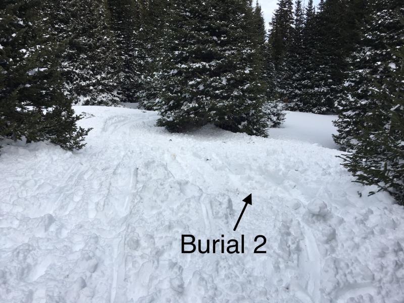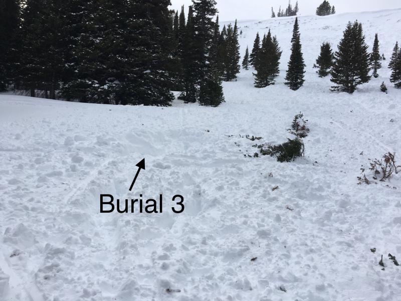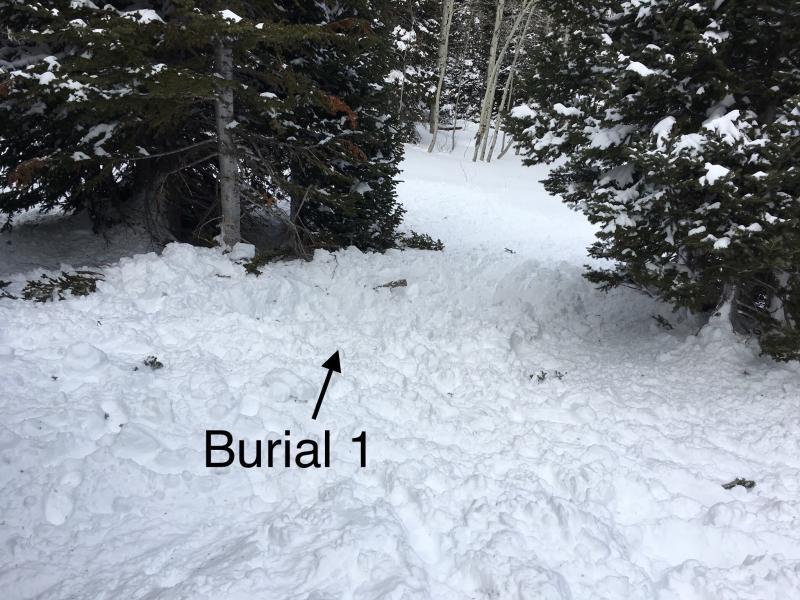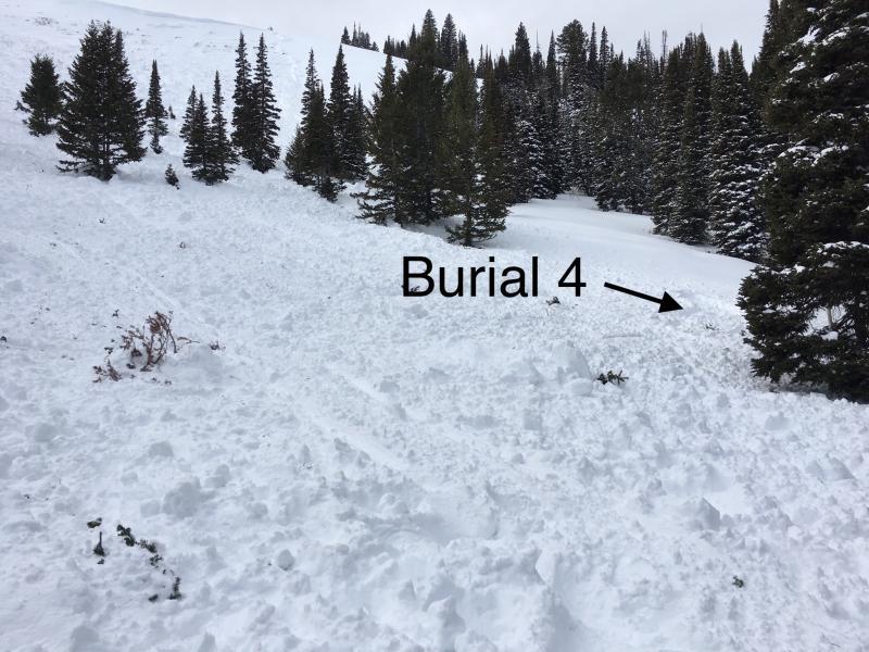 One person saw the avalanche breaking and yelled to the other three. The tried to get away but all 4 were caught and partially buried. Three were able to get out on their own. The fourth deployed his air bag backpack. He was buried face down with only one boot and part of his air bag showing. The other three dug him out.