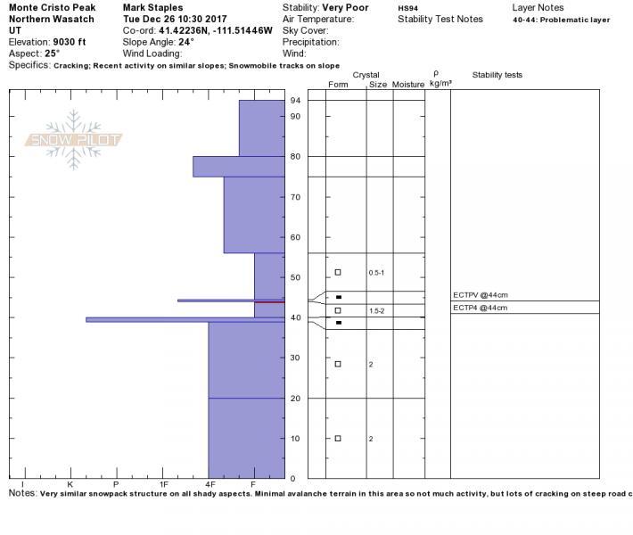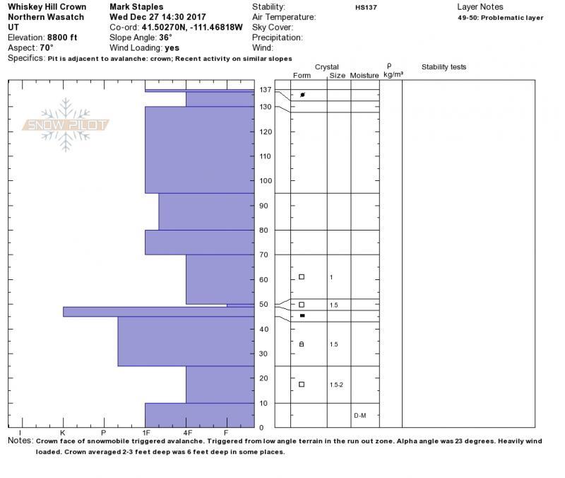Attached are two profiles. The first is from the crown. The second is from Monte Cristo Peak the day of the avalanche at a similar aspect and elevation.