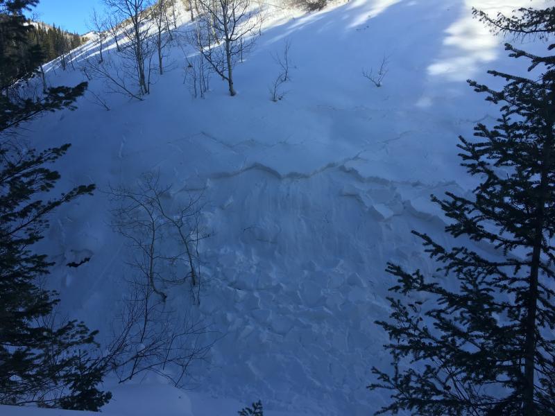 This slide is about 1/2 mile up off the Franklin Basin Road up Hell's Kitchen canyon. We've seen it slide here several times on our hike in to ski Steam Mill Peak. Widespread collapsing continues, but instability has gotten deeper with collapsing occurring on the sixth time up the same uptrack. Cracking has decreased, but still occurs on wind loaded east slopes. Upper elevation snow is hanging in there thanks to cool winds that are keeping the snow surface cold despite the relatively high temperature.