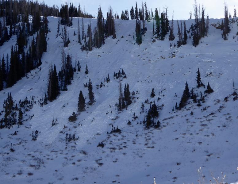 This avalanche released late during the Christmas storm. Unlike the numerous small slabs in BBQ Bowl from the same cycle, this avalanche was well connected. Facets that formed in October and November were the weak layer.