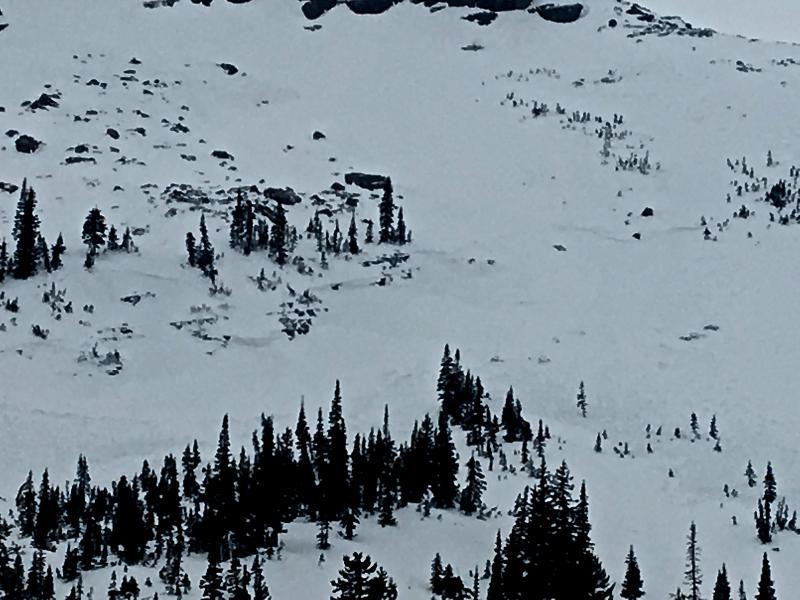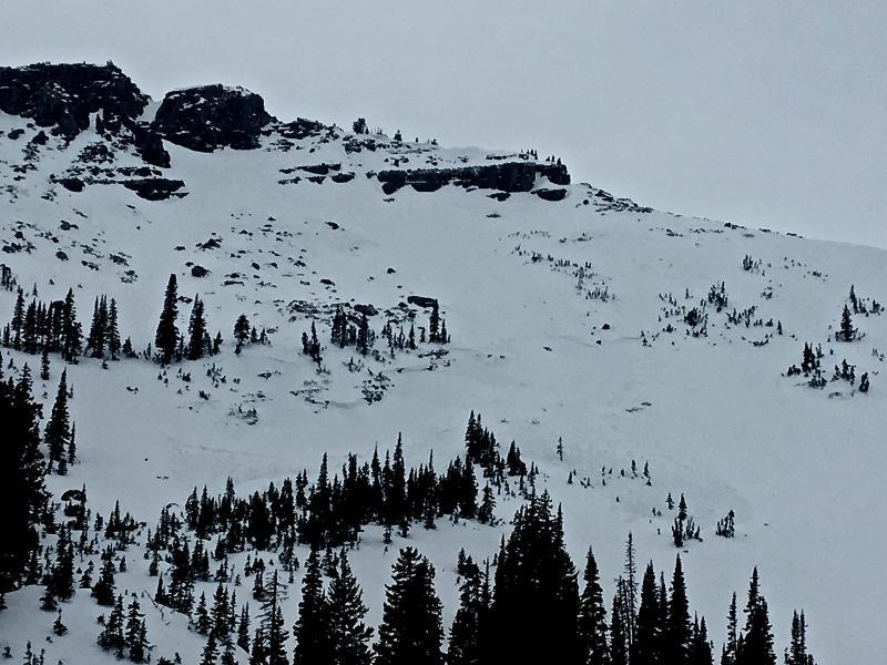 The broad mid-slope avalanche didn't run too far as it mostly stopped on a small bench below. I'm not sure when this hard slab avalanche occurred or if it was natural or remote triggered. Looked fairly fresh and there were sled tracks in the bowl to the north (right side looking up).