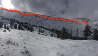 Connecting the dots of over a mile wide set of naturals from Willard Peak (SE facing) to Ben Lomond (NE) facing at 9300'. Crown not investigated but guesstimated at 2' deep with lowest crown at 8300' on headwall. Hard to really note any undisturbed snow for over a mile along the headwall and below. Interesting to note the dry snow slides then gouged into wet loose below 8000' feeding into Cutler Creek.