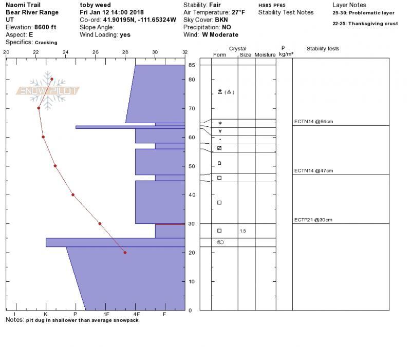 Snow profile from 1/12/18 nearby, but about 600' lower in elevation than the avalanche.