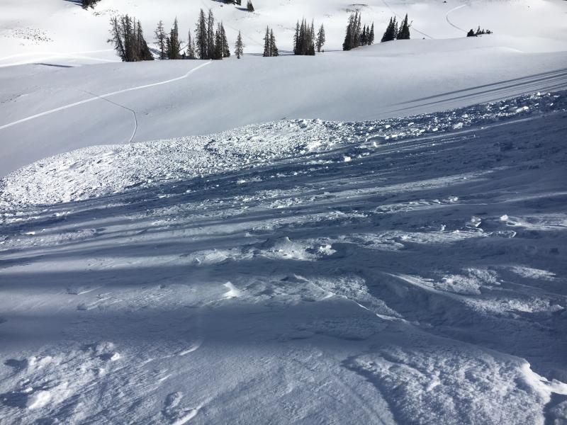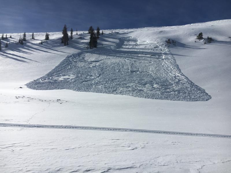 Sledder remotely triggered this slab from flat terrain, low on the slope. Not a big slide, but our current snow structure comprised of strong snow resting on top of facets with a rain crust as the bed surface is inherently dangerous. Once triggered, avalanches are running faster and further than you might expect.