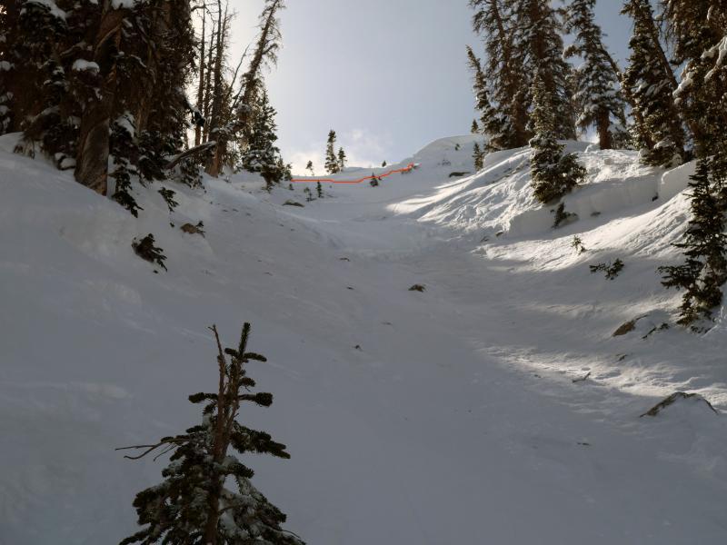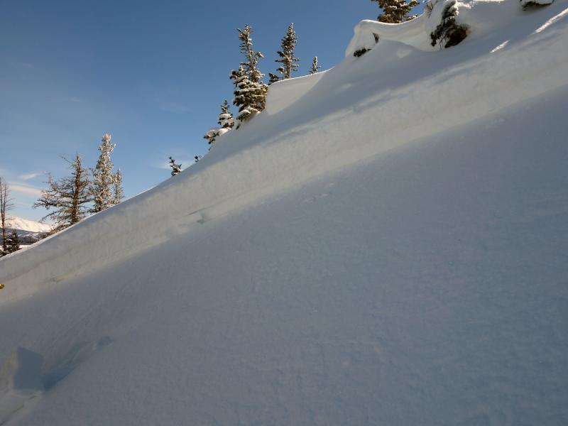 This slope has not been ridden this year, but has likely avalanched. Took a couple steps on the slope to test it and got a good collapse. Slab failed initially on mid-pack facets approximately 60 cm down from the surface. However, as the slab ran it stepped down into deeper weak layers, ultimately stepping down to the ground.