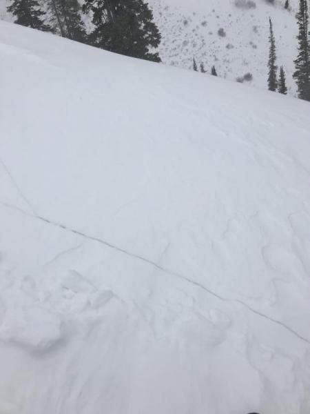 We noted a crack that formed from the fracture to as far back as 30' back on the ridge from the crown face. Ski pole in first photo is marking the location of the crack from the crown face located on the left side of photo. Crack is in the foreground and crown is in the background at edge of snow in second photo.