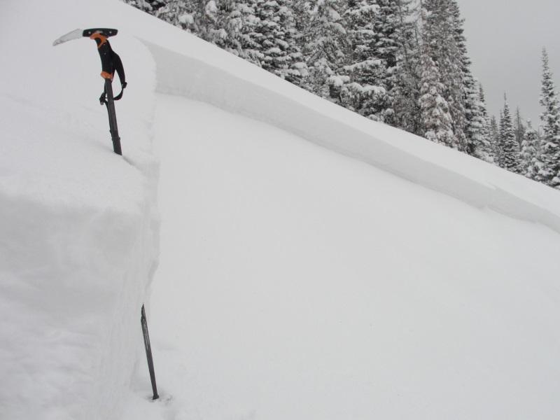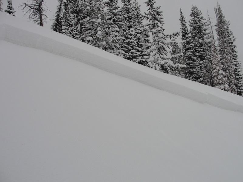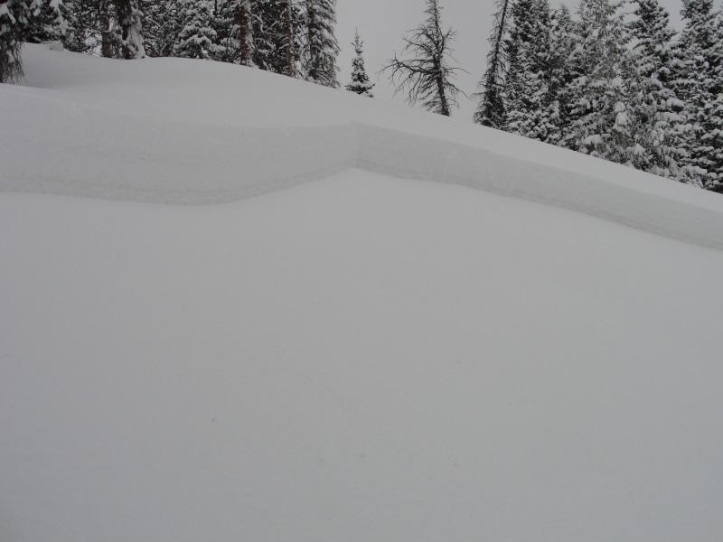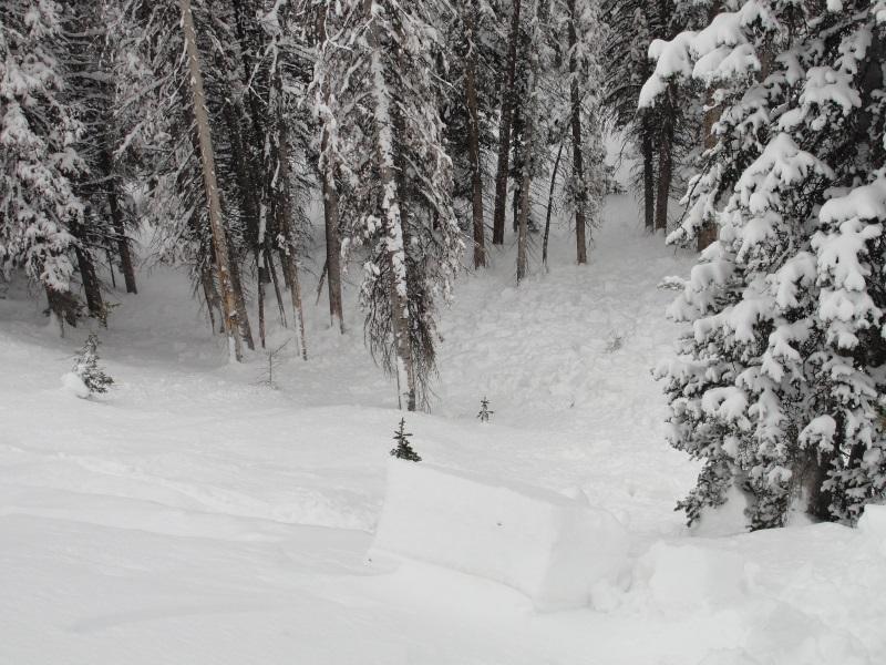 I triggered this from the shoulder while skinning back up. This is a very small rollover at mid-altitude on a north facing aspect. Snow pack is generally 115 cm in the area with 12"of new light density snow. As has been the case, this ran at the rime crust layer that formed 5 weeks ago in late January.