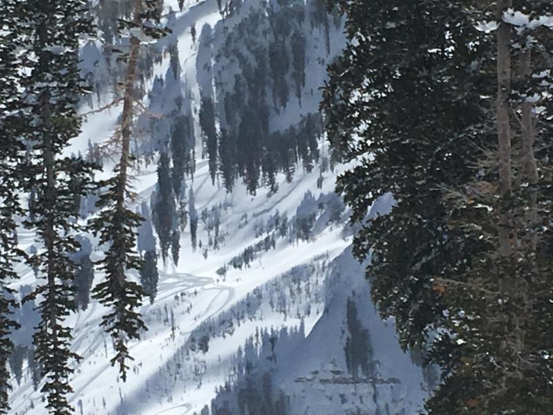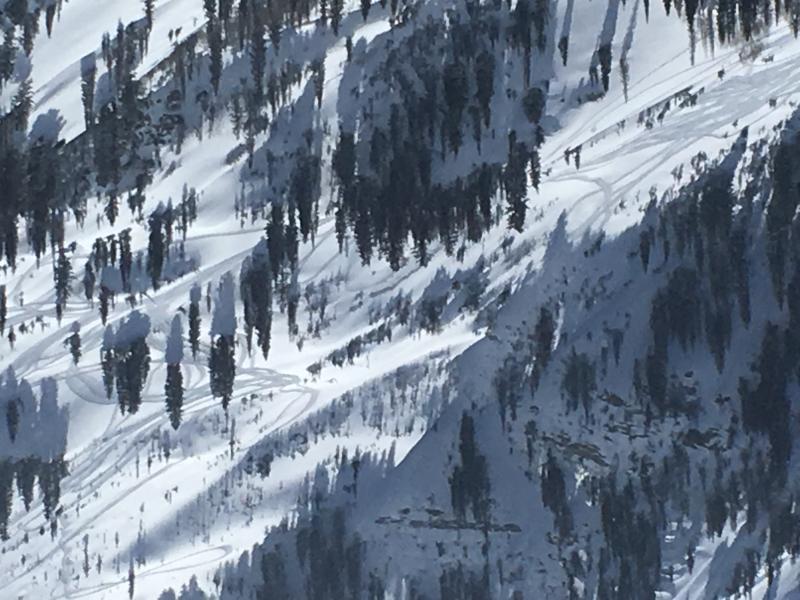 Watched one, or two sledders meander all over the steeper slopes of Y Not and Outhouse in Mary Ellen Gulch. High marking without incident for the most part. Turned away to have some lunch and when I looked back there was a small slide at the apex of one of their high marks mid slope on a convexity near some scrubby trees. I assume they throttled out, but did not witness the slide and the trigger continued to rip around on even larger faces without additional activity. See Slide pictured in middle of frame. Approximate dimensions viewed from across drainage.