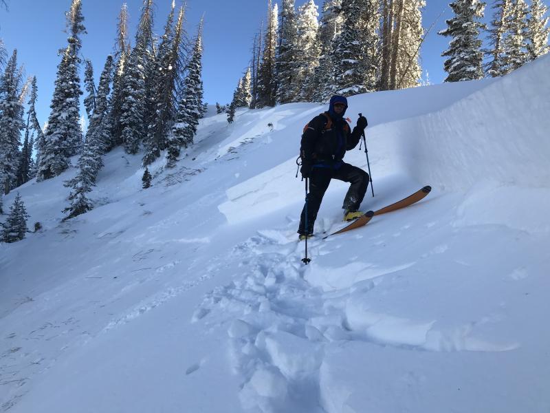 My partner and I found a cornice that we could safely cut off and drop onto a slope below to see if it would avalanche. It produced a very large avalanche failing in the weak faceted snow near the ground. This confirms my suspicions over the last few weeks that our buried weak snow is still very much capable of producing dangerous avalanches.