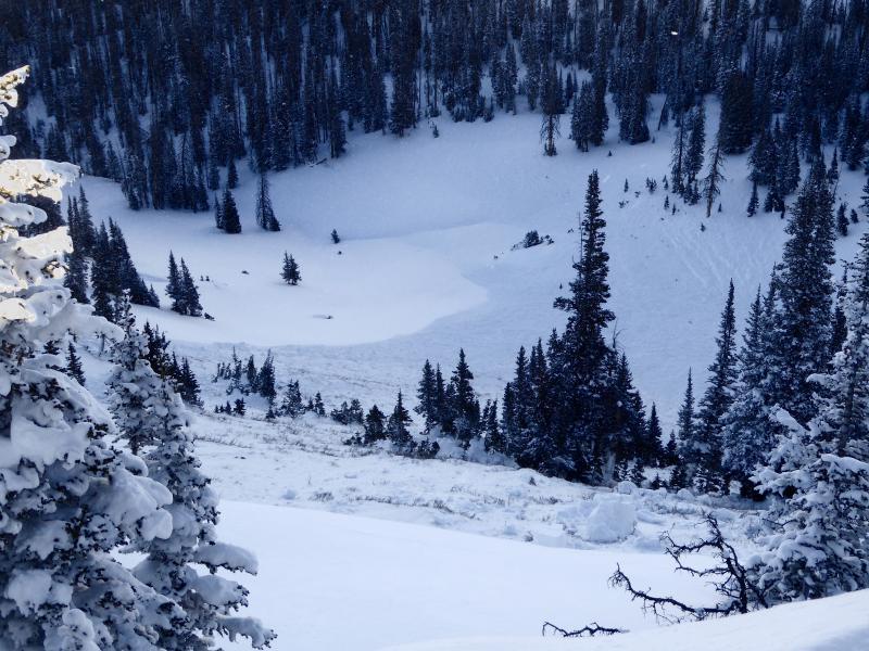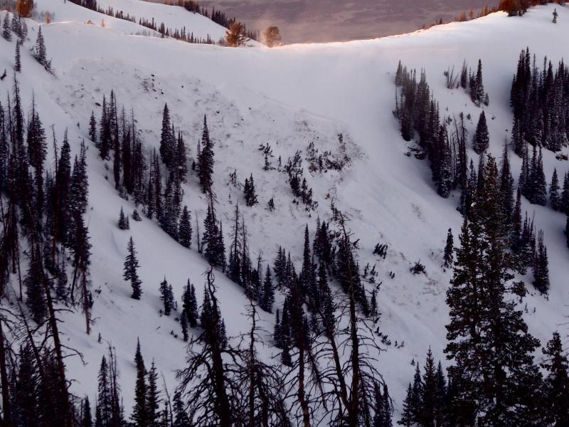 There were actually two avalanches. One that the cornice drop triggered and another larger one which was triggered sympathetically in the next path to the west.