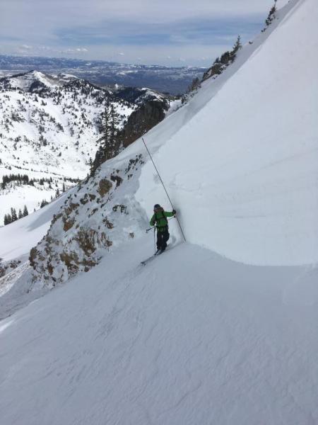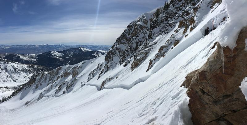 This avalanche was initiated by a single hand charge on Thursday March 8th, 2018. The route members tossed several shots onto a hanging snowfield on the eastern flanks of Silver Creek Peak without results. At approximately 8:30, the 2nd or 3rd shot placed in the area initiated a 2'x150' avalanche failing on the weak snow near the ground. The slide cascaded over the 80' to 100' cliff band and crashed onto the open bowl below. Slope angle was measured at this point. Upper field was likely closer to 32 degrees steepness. The resulting avalanche propagated over 1500' wide and stepped down from the initial faceted layer 140cm deep into basal facets as it reached numerous rock fingers lower in the bowl. The 1F hard slab broke apart and piled up on several of the benches below, and was eventually channeled into the gully systems below. Old tracks from former skiing parties in the lower drainage were obliterated and the debris piles were over 4 meters deep in places. The toe of the debris came to rest nearly 1750' below the placement of the explosive. The crown below the rock band averaged 150cm to 180cm, with its deepest point reaching 275cm. The 2/18 dirt layer is clearly visible throughout the crown and flanks, and even in the chucks of debris that were not pulverized.
