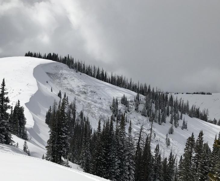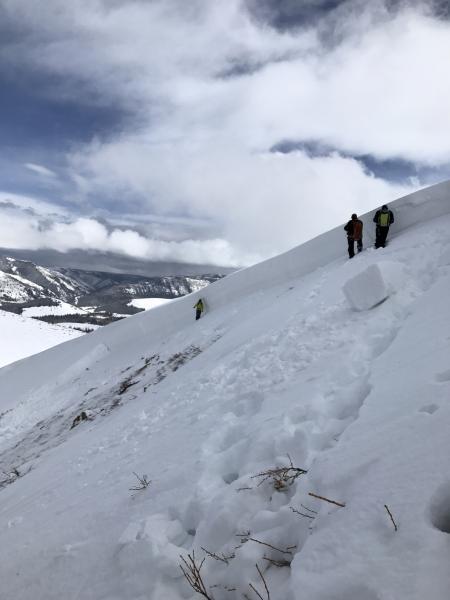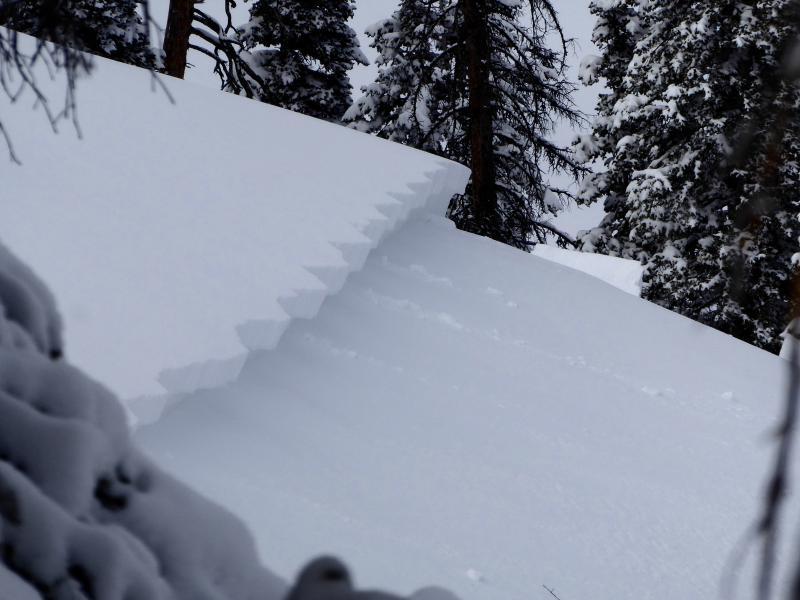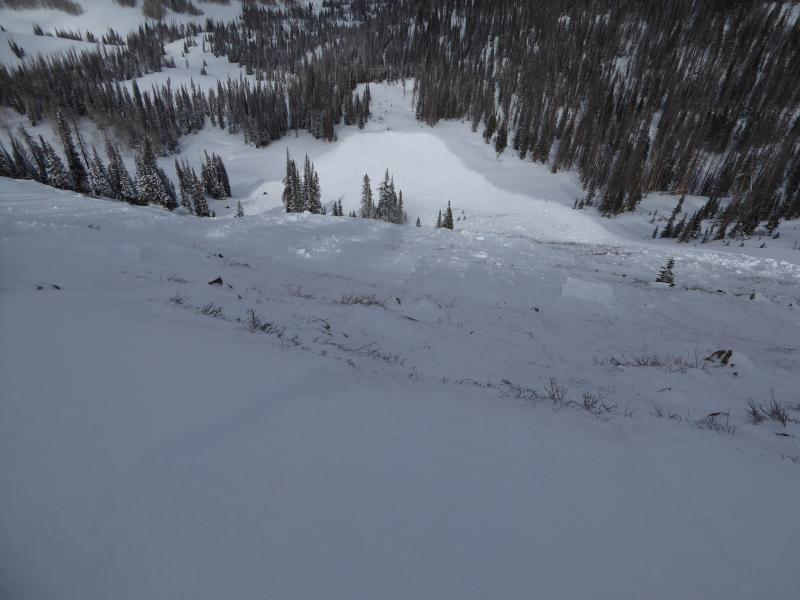 I triggered this avalanche from the safety of the ridge line. My partners and I thought it might go and all it took was riding around on top of the ridge for me to find the sweet spot. It released "remotely" which means it released from a distance away from me. I felt a slight collapse and a shooting crack from my vantage point. It broke into weak sugary faceted snow near the ground which I collapsed when I was "monkeying around" on the ridge. The deepest part of the fracture line was over 5 feet deep.