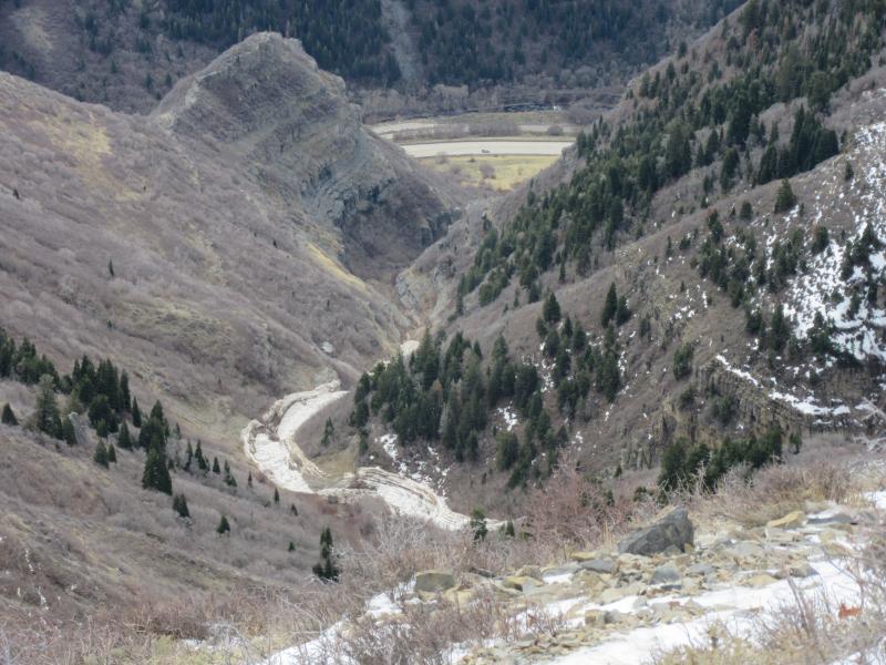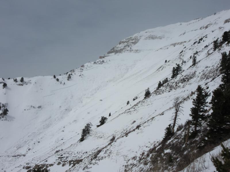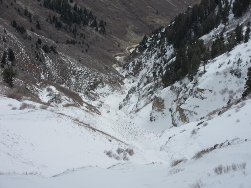 Storm on the 22nd to 23rd produced moderate to heavy rain up to 10000'. Winds remained strong out of the SSE for the first half of storm with winds peaking around 4-5am on the 23rd. No snow to transport due to previously wind scoured fetch and only rain falling prior to slide. One thing of note is that the precip site at Mid Mtn only recieved .39" of precip while Aspen Grove recieved 1.66" of rain during the same period. Prior to this avalanche we noted on an adjacent test slope 2m of snow just below the ridges and 1.5m of snow mid slope with a persistent week layer buried on average 80cm below the surface (top 80cm was 1F-P hard) that was showing moderate to hard propagation results with ECT tests, but moderate results on PST and Compression tests. Taking just the one start zone into account we classified this slide as a HS-AA-R3D3- G/O. Crown measured 2700' in length. Average crown depth of 3' with the deepest being 6-10' deep. Vertical Fall 4700'. (last 1300' vertical of the track did not have snow in it prior to the avalanche) Toe of the debris terminated at 5700' MSL.