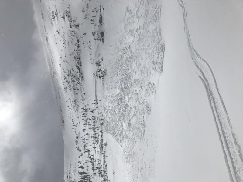 We spotted this slide from a ways away and went over to check it out. It was a natural avalanche released within the last few days (Apr. 6th or 7th). It failed about 3.5 to 4 feet below the snow surface and was approx. 150 to 200 feet wide. The slide ran about 450 feet. It looked like it may have been triggered as a secondary slide because there was another smaller crown above a cliff band directly above the crown. We weren't able to go up and take a closer look at the crown because we weren't confident of the stability higher on the slope.