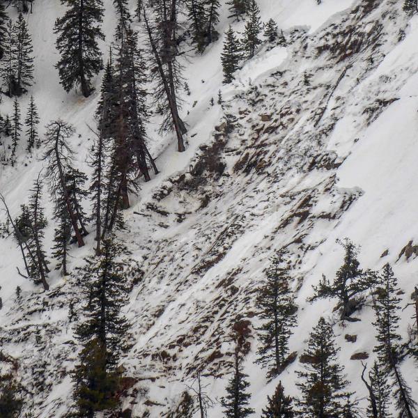 A number of natural wet slab avalanches released during rain on Saturday, April 7. These all were below 9500' in elevation. They were initially small wet loose avalanches which then triggered wet slabs as they descended the slopes. They broke to the ground. The snow above the ground was wet faceted snow. Observations in similar terrain showed these faceted snow grains became damp a few weeks ago. Additional weight from the rain and perhaps the rain further weakening the snow near the ground caused these avalanches.