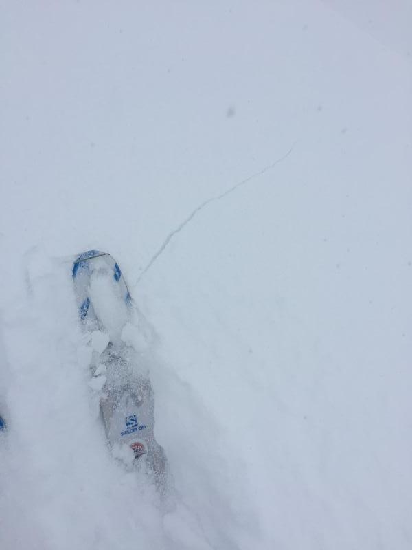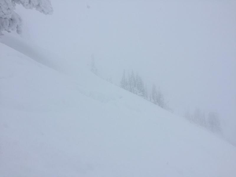 Moderate winds moving snow onto NE shoulder of Ben Lomond peak. This slide and several others near by only involved wind blown new snow with no apparent stepping down to lower layers. Cracking noted on skin track near natural activity. Poor visibility due to wind and cloud cover.