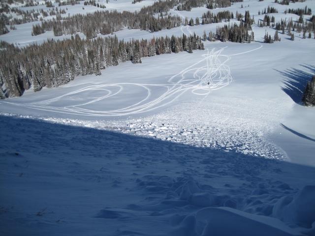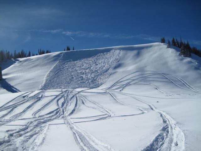 FORECASTER NOTE- Ted knows the western Uinta's better than anyone around and his observations, snow and avy expertise are top notch. We were a bit baffled by this one. The tracks near the slope were from yesterday's group of riders who DID NOT trigger the slide.... there was a few inches of snow on the bed surface from the night before.  We talked this one through and concluded the slide was remotely triggered either from low on the slope or from the ridge above Yamaha Hill.