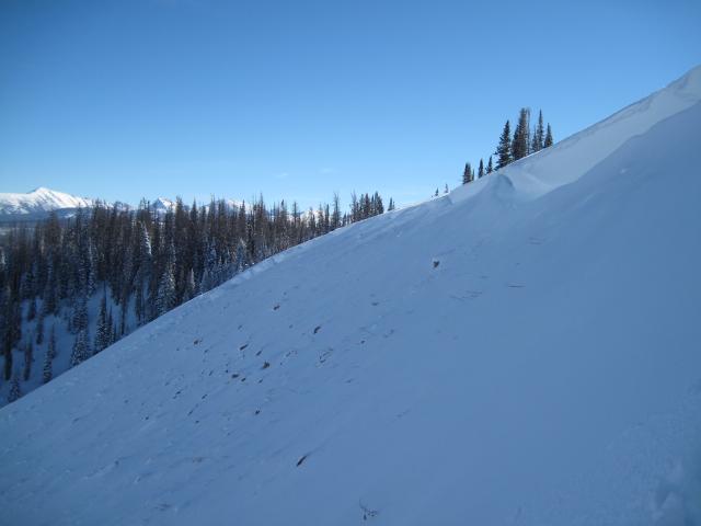 Spotted this slide on the drive to work today.  My first thought was human caused, but after looking around at the debris which had a few inches of new snow on top, this likely occurred from gusty winds overloading the buried weak facets.  Or possibly this was triggered from riders on the ridge which I could not confirm.   The avalanche depth ranged from a couple feet to over 6' and failed on facets above a crust formed back in October.  Walking up the bed surface there was still a slick firm crust with weak sugary snow that will get buried with future storms and this could be a repeater slide later this winter.