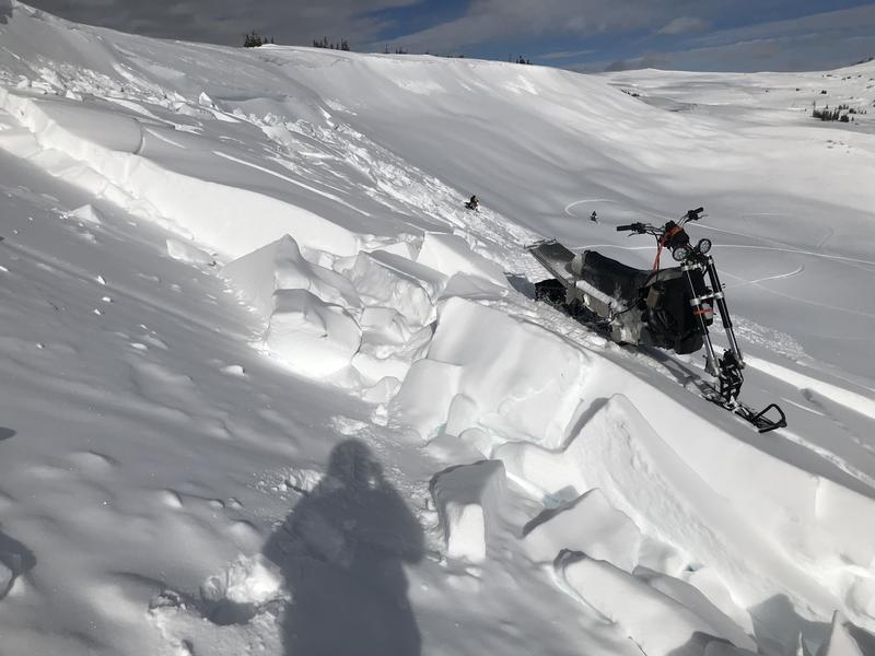 A snowmobiler triggered an avalanche after dropping off a ridge onto the slope below. He was able to ride off in front of it and was not caught. This was in Seely Creek east of Ephraim Canyon.