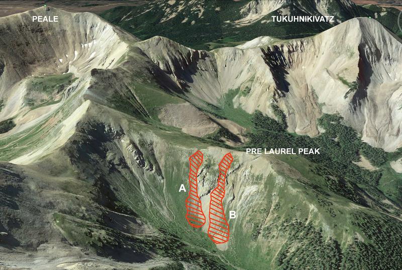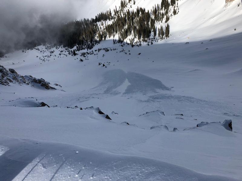 Two adjacent avalanches occurred during the night of Dec 25, this report refers to slide B in the attached image. Avalanche initiated as a fresh wind drift at the ridge crest approximately 12" deep and 30' wide. As it moved down slope it triggered a wider, and deeper avalanche approximately 125' wide and 2' deep that appeared as if it stepped down into a persistent weak layer of facets around rocks. It was difficult to ascertain from our vantage point, and dangerously wind loaded slopes, in extreme terrain prevented closer examination from above.