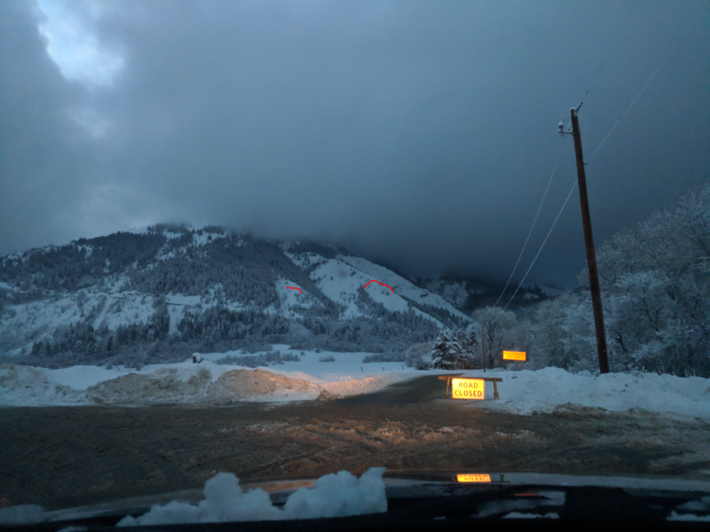 Two avalanches hit the North Ogden Divide today. One of the avalanches is quite large D2+ the other a D2. These both released at a similar elevation and aspect. I am guessing they failed on the weak snow that was forming at lower elevations last week. I went over to take a look at the avalanches tonight right before dark. The larger avalanche on the "Chicken Creek" path had lots of dirt in on the bed surface which makes me think it failed on or near the ground. Will try and find out more tomorrow.