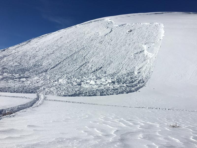 Sledder rode through the bottom, on flat ground. As soon as the sledder was past the hill, the whole mountain slid, starting at the top. Large slab slide about 5' deep at the top, all the way to the ground. Throughout the day, we came across a few of these. Look like most of them were huge wind blown slopes facing NorthEast.