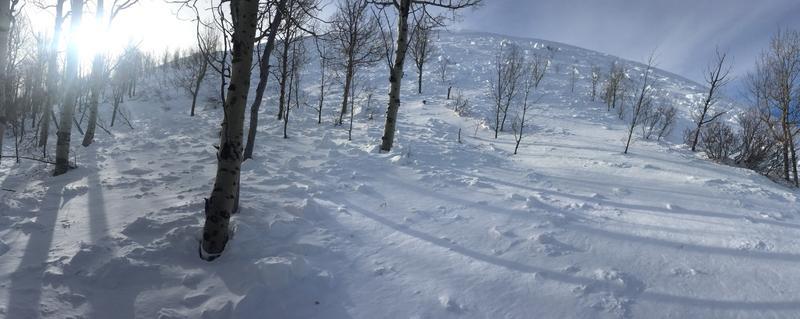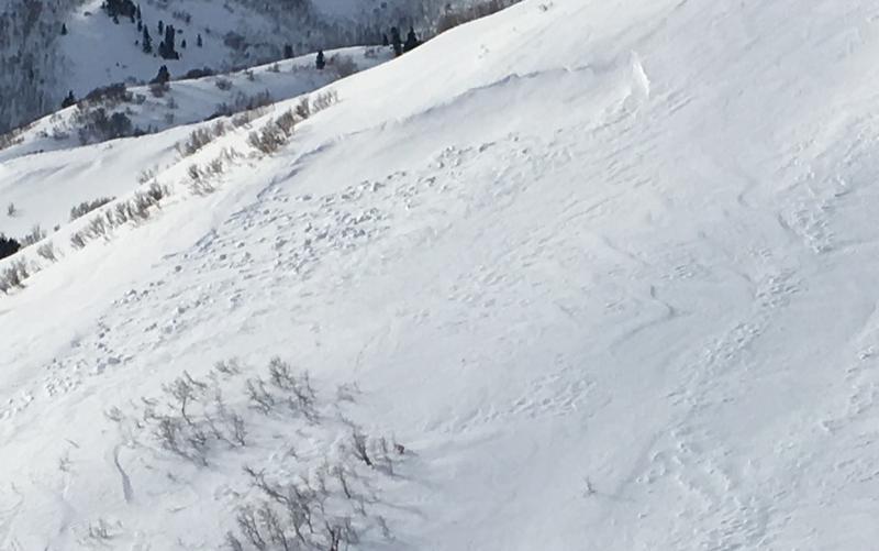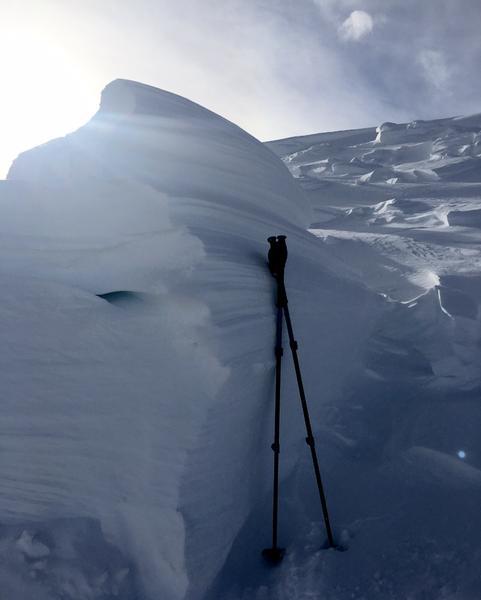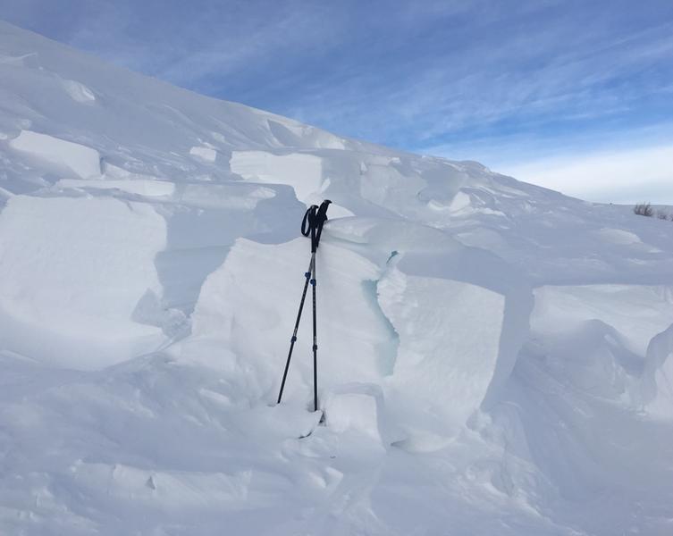 Found a few hard slab avalanches today along the ridge lines between 7500’and 8000’ on East through NNE aspects in the Lewis Peak Area. These likely failed during Monday’s wind event, but possibly earlier in the storm. The slope angles were what surprised me - I measured 27 and 31 degrees on one starting zone. I had to recheck it with my phone’s inclinometer because I didn’t quite believe it. Even lower-angled adjacent slopes slid that were connected to it. Large blocks of debris, many taller than my 130 cm poles.